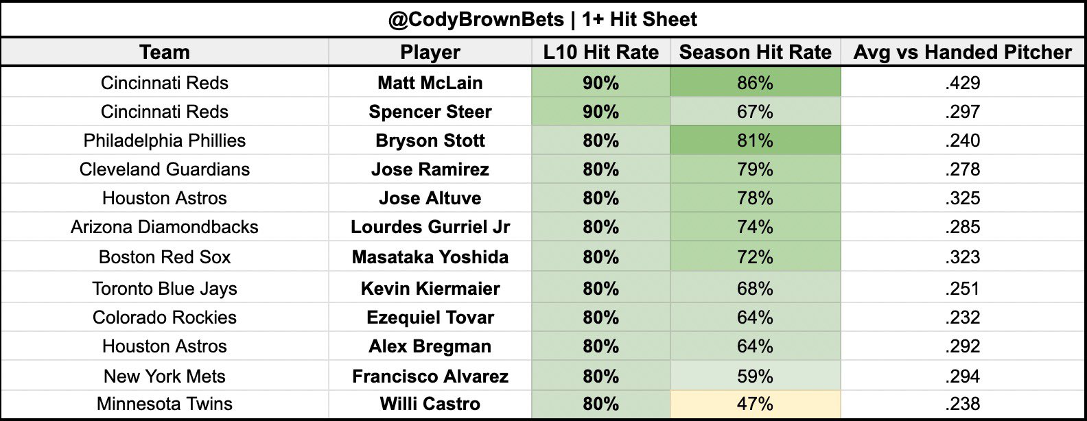 Cody Brown Bets On Twitter Baseball Hit Sheet 06 01 This List Shows All Players That Have Recorded A Hit In At Least 8 Of Their Last 10 Games L10 Hit